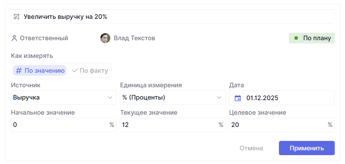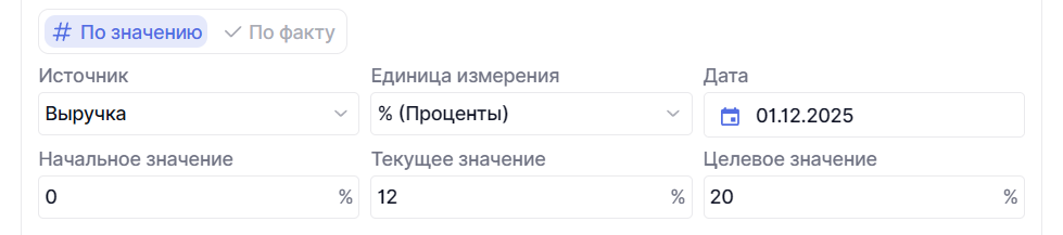 У каждого результата и цели есть начало, то состояние, в котором метрика или прибыль сейчас, и конец, тот итог, который мы хотим видеть. Поэтому в начальном значении указываем текущую начальную цифру, с которой начнется прогресс. В поле Текущее значение нужно будет указать ту цифру, что актуальна на выбранную дату результата. А Целевое значение это итоговое значение, которого нужно достичь.