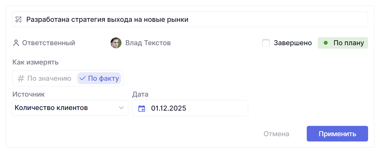 В Shtab ключевые результаты используются для объективной оценки достижения цели. Они могут измеряться числовыми значениями или фиксироваться по факту выполнения. Но вне зависимости от типа измерения, ключевой результат всегда отражает реальное состояние прогресса, а не субъективную оценку.