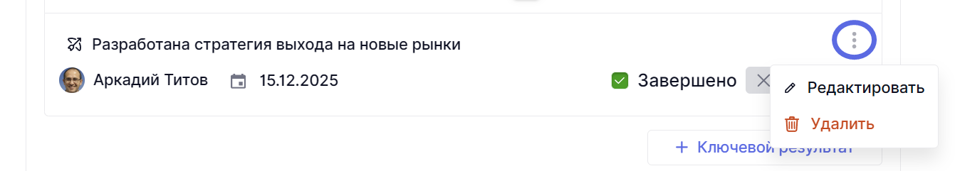 Название, ответственного, дату и статус можно будет изменить отсюда, а для изменения типа подсчета результата нужно будет открыть редактирование. Сделать это, а также удалить результат, можно будет в меню по клику на три точки.