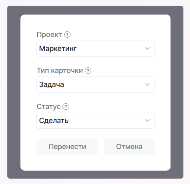 При переносе достаточно выбрать новый проект, указать тип карточки и статус, в который будут перенесены задачи.
