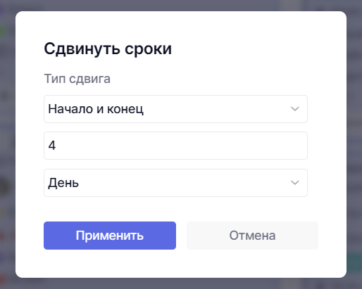 Будут сдвинуты даты начала или даты начала И конца у карточек. Для этого действия важно, чтобы у карточек уже были установлены сроки.