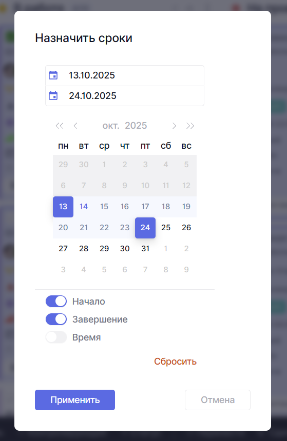 Выберите действие, задайте нужные параметры и подтвердите его — изменения сразу применятся ко всем выбранным задачам.
