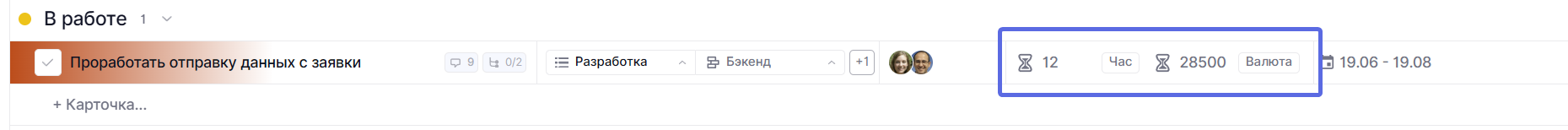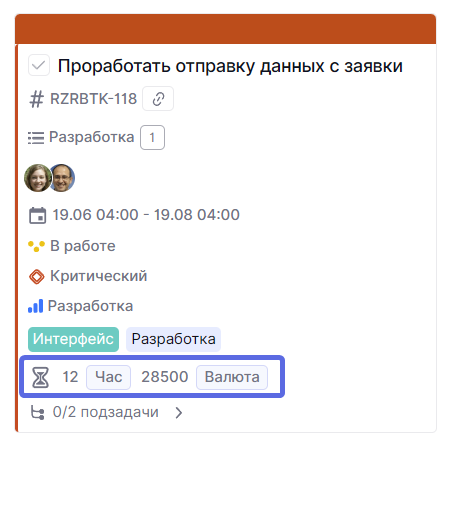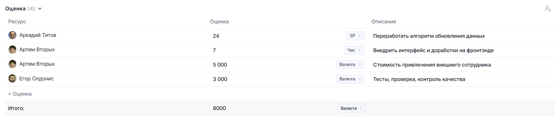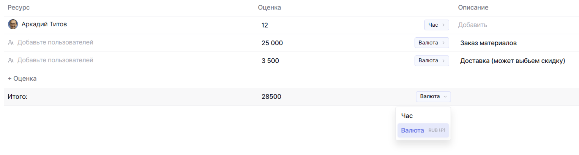 В каждой карточке доступен блок оценок. В нем можно оценить задачу по сотрудникам и в нужной метрике: деньги, время, сторипоинты или собственная единица измерения.