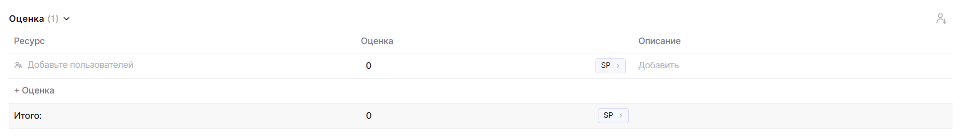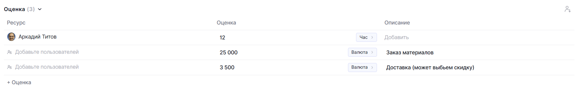 В каждой задаче есть блок оценок. По умолчанию в нем не добавлены сотрудники и не заполнены значения.