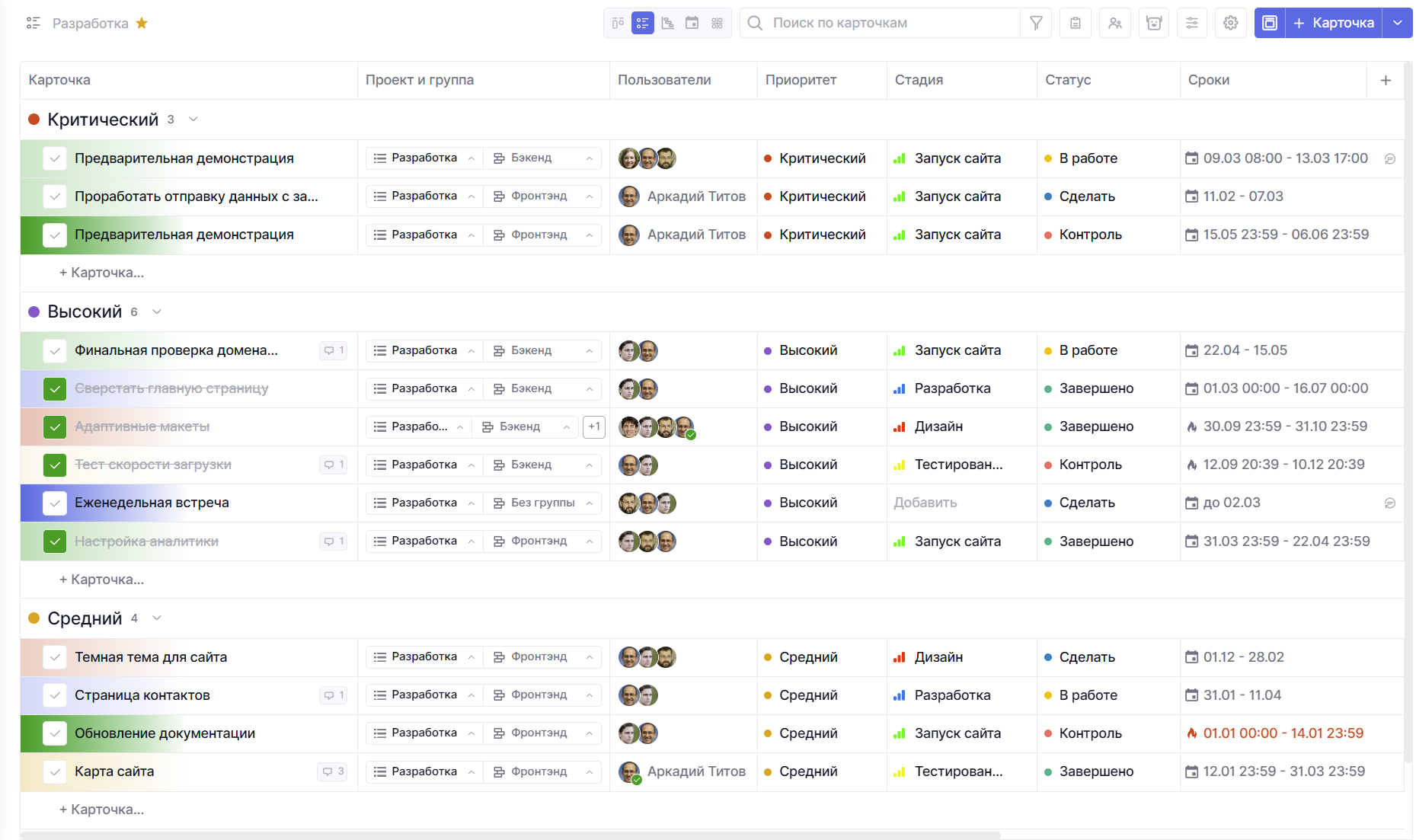 Карточки можно перетаскивать из одной группы в другую. Левой кнопкой мыши зажмите на строчке с нужной вами карточкой и просто перетащите ее в новую группу. Так можно менять приоритет, статус, стадию, исполнителя, метку или группу карточки. Или же просто установить порядок карточек в одной и той же группе.