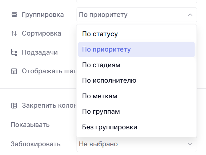 Выбранная опция будет влиять на отображаемые колонки. Если вы выберите группировку по приоритету, то колонки будут выстроены по приоритетам.