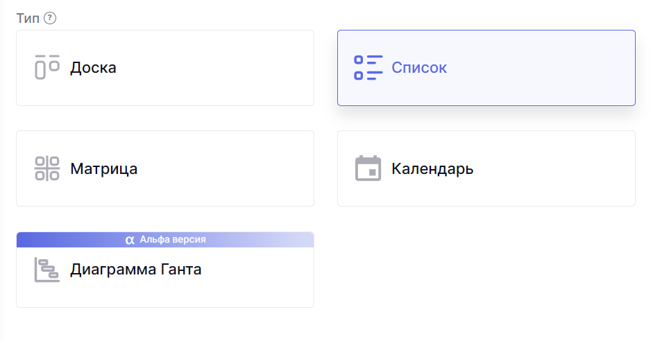 Тип карточки определяет набор полей и блоков, которые будут видны в создаваемой задаче. Разные типы помогают структурировать карточки по их назначению, например, задача, сделка или встреча.