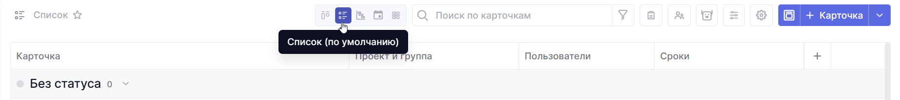 В списке карточки делятся по группам. По умолчанию установлена группировка по статусам, одна группа = один статус.