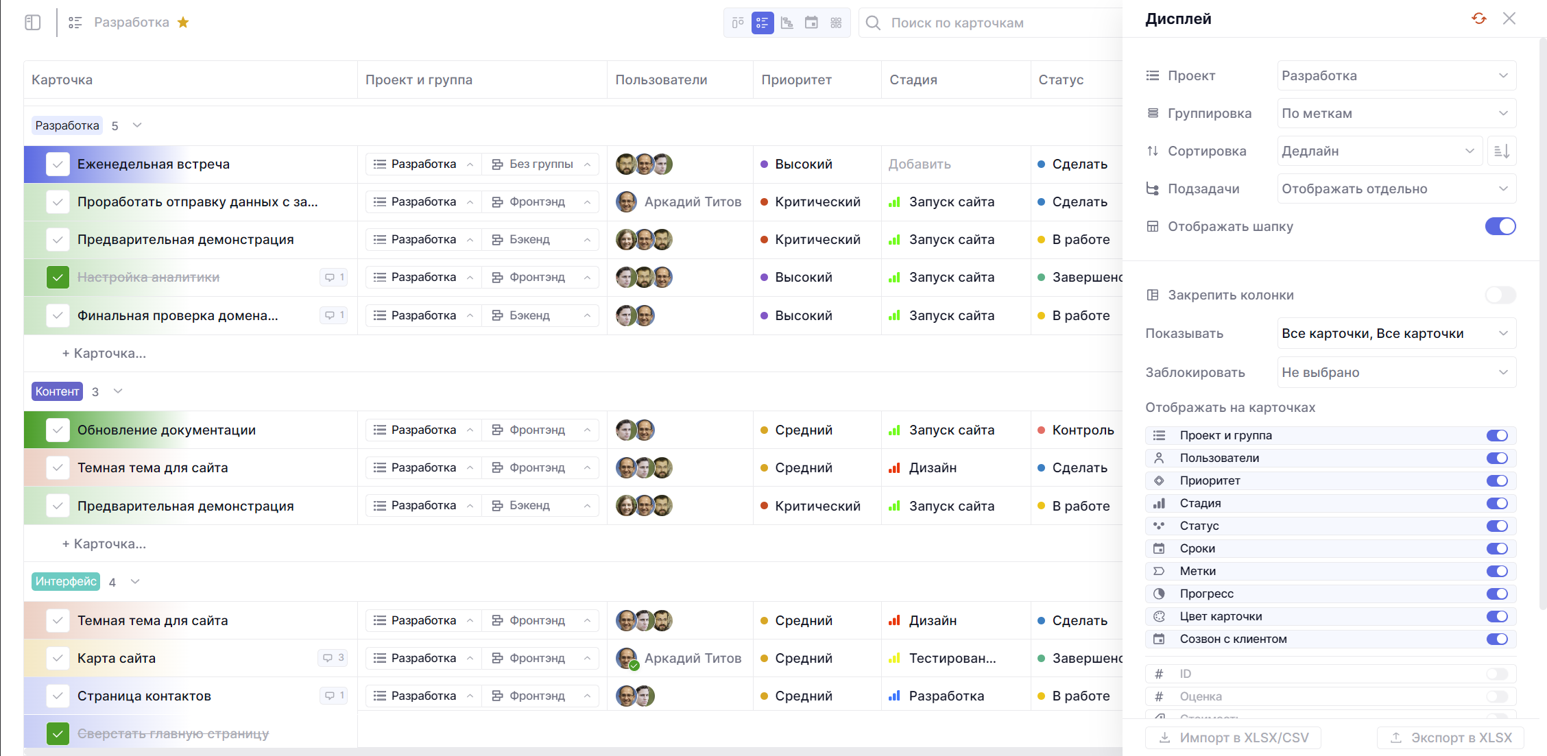 По аналогичному признаку работают и все другие колонки. Сроки, приоритет, стадии, статус, метку, пользовательское поле — все можно изменить, не заходя в карточку.