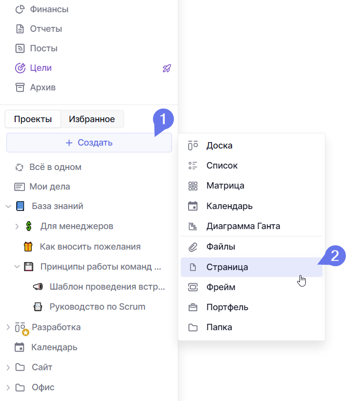 Страница это такое же рабочее пространство, но для знаний и документов. Поэтому чтобы создать страницу, нажмите кнопку добавления нового вида в левом меню и выберите Страница.