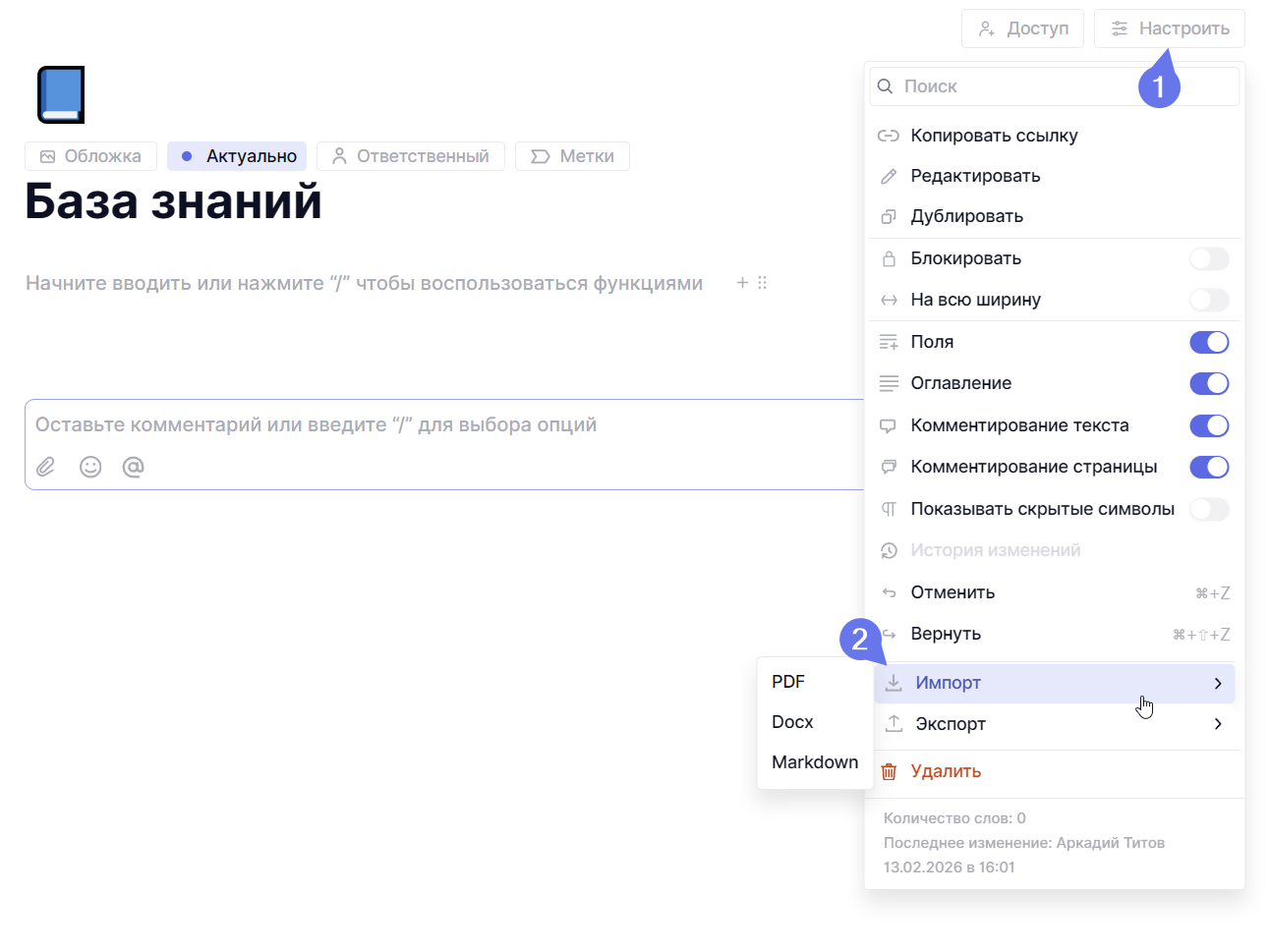 Если у вас уже есть готовый текст, например, регламент или инструкция из другого сервиса, его не обязательно переносить вручную. Для этого откройте настройки страницы в правом верхнем углу и выберите пункт Импорт. Текст и списки со всеми стилями форматирования загрузятся в страницу, а вы сможете сразу редактировать и структурировать его.