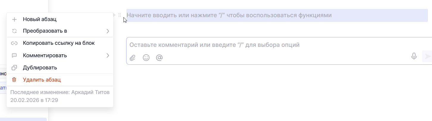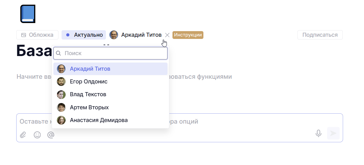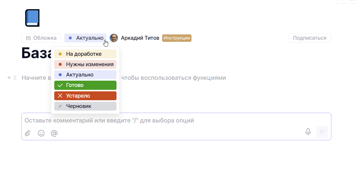 Статусы зафиксированы системой и не редактируются. При этом изменить статус может любой сотрудник. Например, если в инструкции что-то непонятно, сотрудник может оставить комментарий и перевести страницу в статус Нужны изменения. Команда увидит, что документ требует внимания.