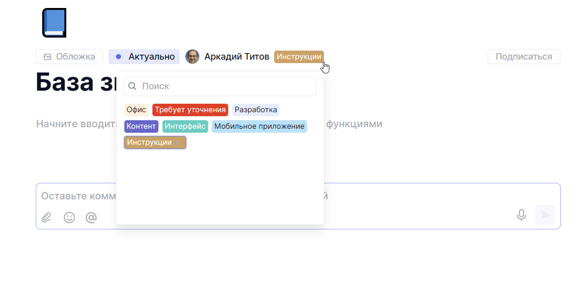 К странице можно добавить дополнительные метки. Они помогают обозначить тип или категорию документа. Инструкции лучше помечать меткой Инструкции, шаблоны заполнения документов помечать меткой Шаблоны и так далее.