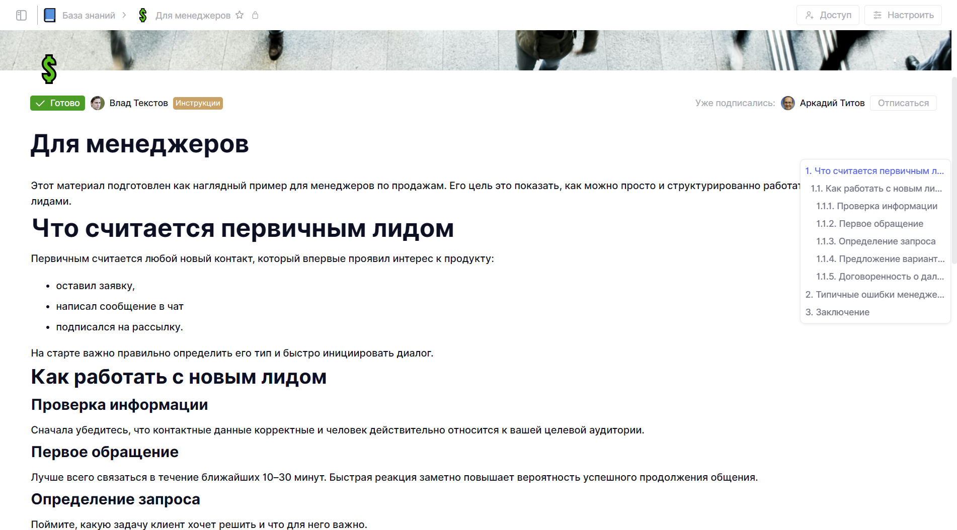 Поможет понять состояние страницы, в работе ли она, актуальна или требует доработки. Это особенно удобно для регламентов и инструкций, которые со временем обновляются.