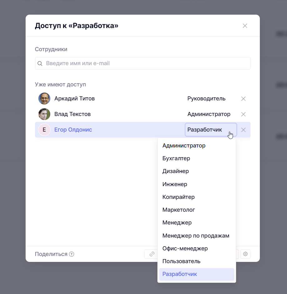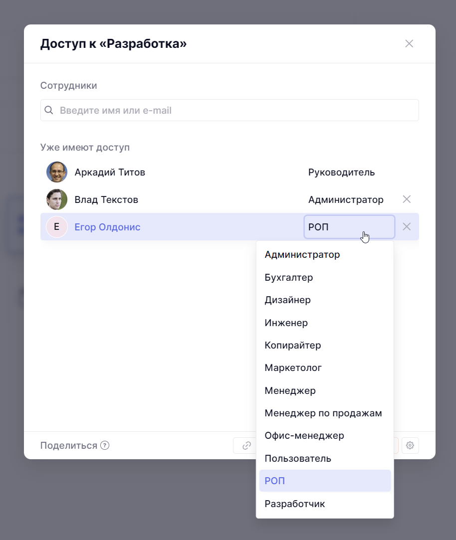 После создания роли заходим в нужное пространство, откроем настройки доступа и Егору установим роль Руководитель отдела продаж.