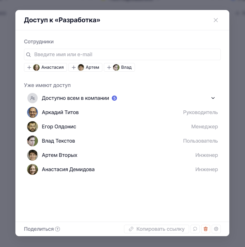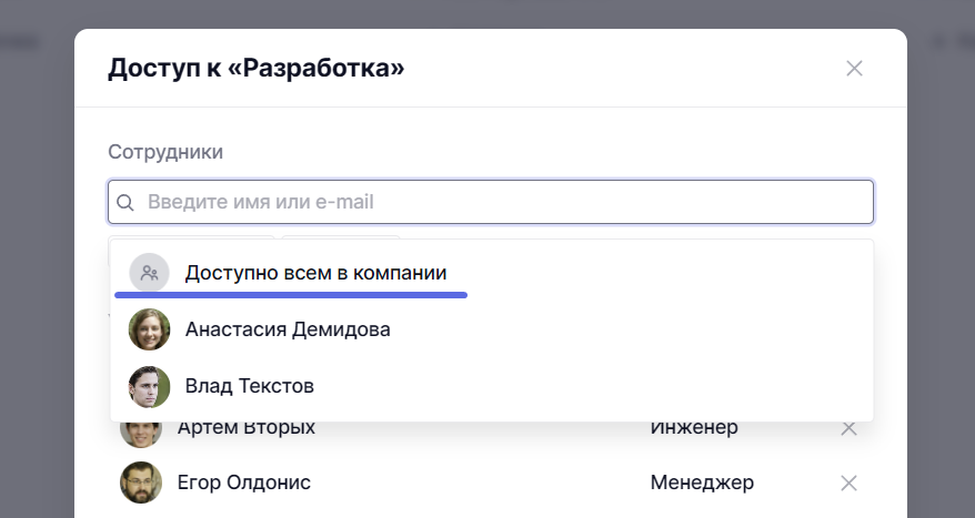 А для того, чтобы вновь сделать пространство доступным всем в компании, выберите в поисковой строке соответствующий вариант, либо же удалите всех сотрудников из этого списка.