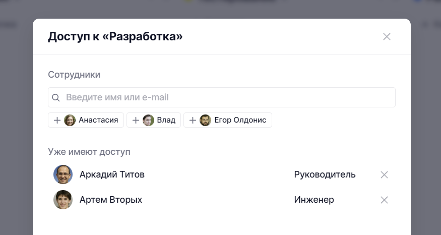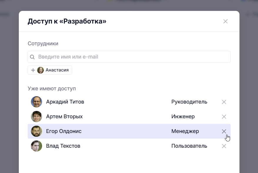 Если вы хотите убрать сотрудника из доступов к этому виду, нажмите на крестик рядом с его ролью.