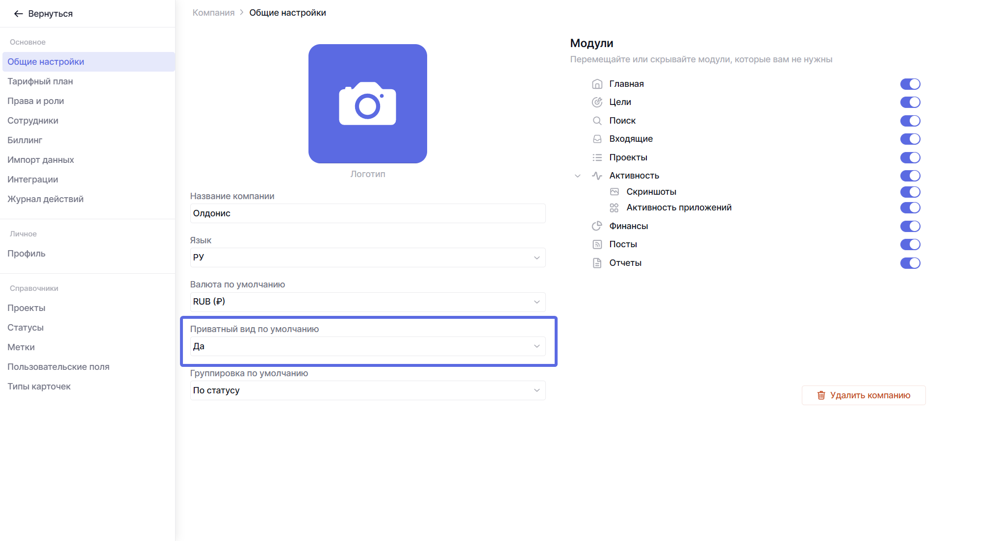 В общих настройках компании можно задать приватный доступ по умолчанию. Это значит, что во всех создаваемых видах по умолчанию доступ будет иметь только сам создатель этого вида. Остальных сотрудников нужно будет добавлять вручную.